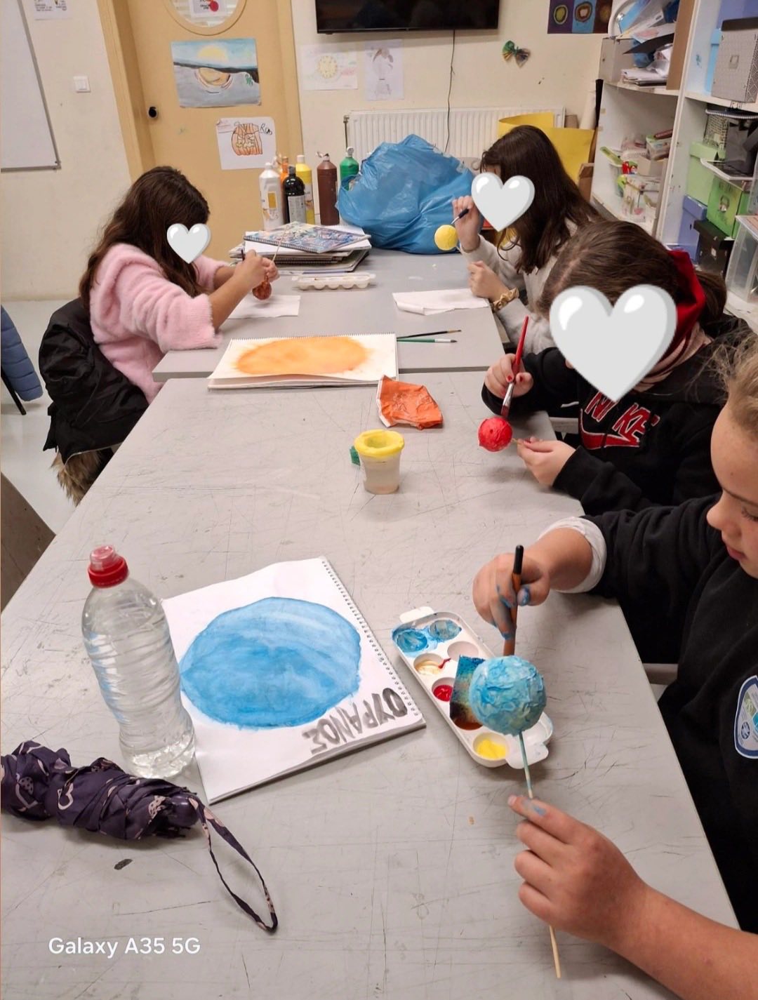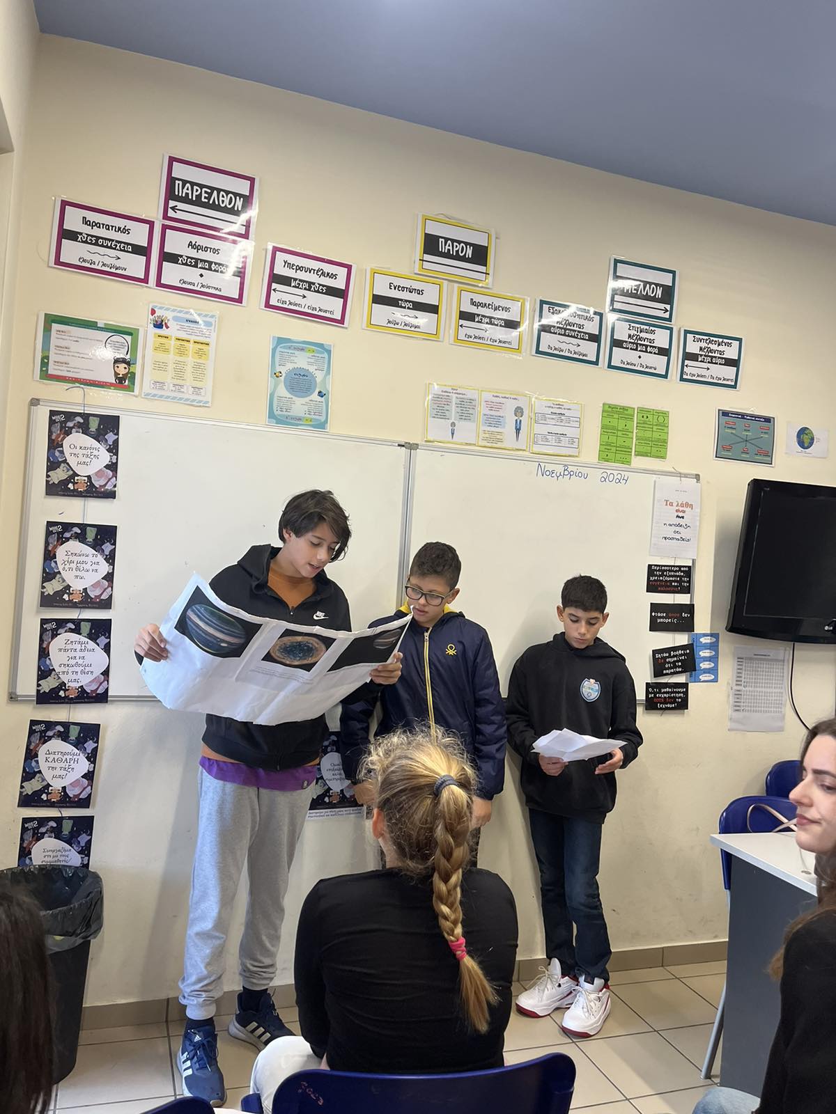 Οι μαθητές και οι μαθήτριες της ΣΤ' τάξης υλοποίησαν τη δράση «Μαθαίνω το διάστημα», η οποία συνδέεται με την ενότητα «Η Γη ως ουράνιο σώμα» του μαθήματος της Γεωγραφίας. Κατά τη διάρκεια της δράσης, χωρίστηκαν σε ομάδες, με καθεμία να αναλαμβάνει την παρουσίαση ενός πλανήτη του ηλιακού συστήματος. Παράλληλα, συνεργάστηκαν για την κατασκευή εικαστικών δημιουργιών που σχετίζονται με το θέμα. Οι παρουσιάσεις κάθε ομάδας ήταν μια εξαιρετική ευκαιρία να μοιραστούν τις γνώσεις τους και να αναπτύξουν δεξιότητες συνεργασίας και δημιουργικότητας.