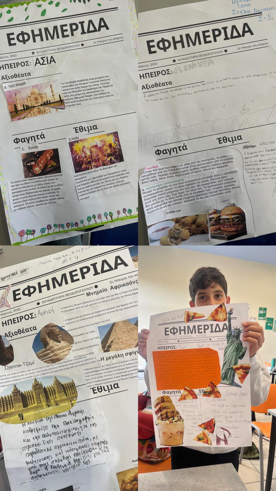Στόχος τους ήταν να αναζητήσουν πολιτισμικά στοιχεία από τις Ηπείρους της Γης. Τα αποτελέσματα της έρευνάς τους αποτυπώθηκαν σε μια μαθητική πολιτιστική εφημερίδα, την οποία παρουσίασαν στη σχολική μας κοινότητα.