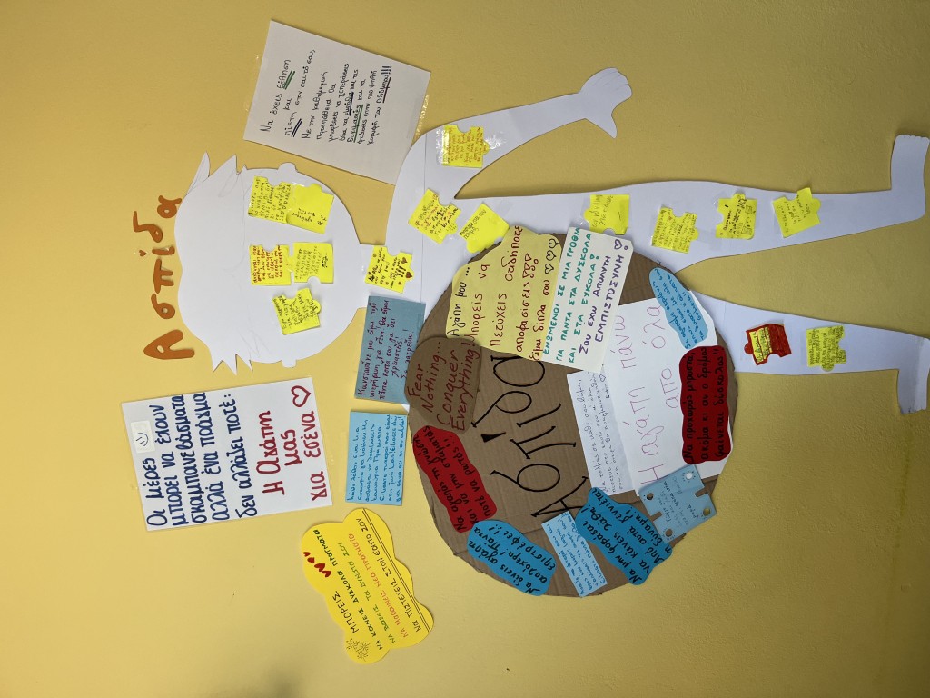 Με αφορμή τον πρώτο θεματικό άξονα των Εργαστηρίων Δεξιοτήτων και σε σύνδεση με το μάθημα της Ιστορίας, οι μαθητές Γ’ τάξης ήρθαν ένα βήμα πιο κοντά. Δημιούργησαν όλοι μαζί ένα «σώμα» πάνω στο οποίο κατέγραψαν όσα τους τρομάζουν ή τους αγχώνουν, μικρούς και μεγάλους φόβους που συχνά δεν λέγονται εύκολα, αλλά γίνονται ελαφρύτεροι όταν τους μοιραζόμαστε. Σε δεύτερο στάδιο, οι γονείς και οι δασκάλες των τμημάτων πρόσθεσαν τη δική τους πινελιά: έγραψαν λόγια ενθάρρυνσης, δύναμης και αγάπης, δημιουργώντας μια προστατευτική «ασπίδα».