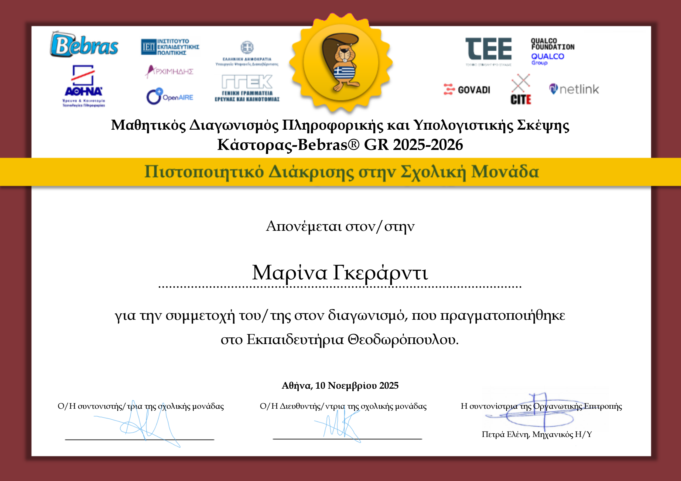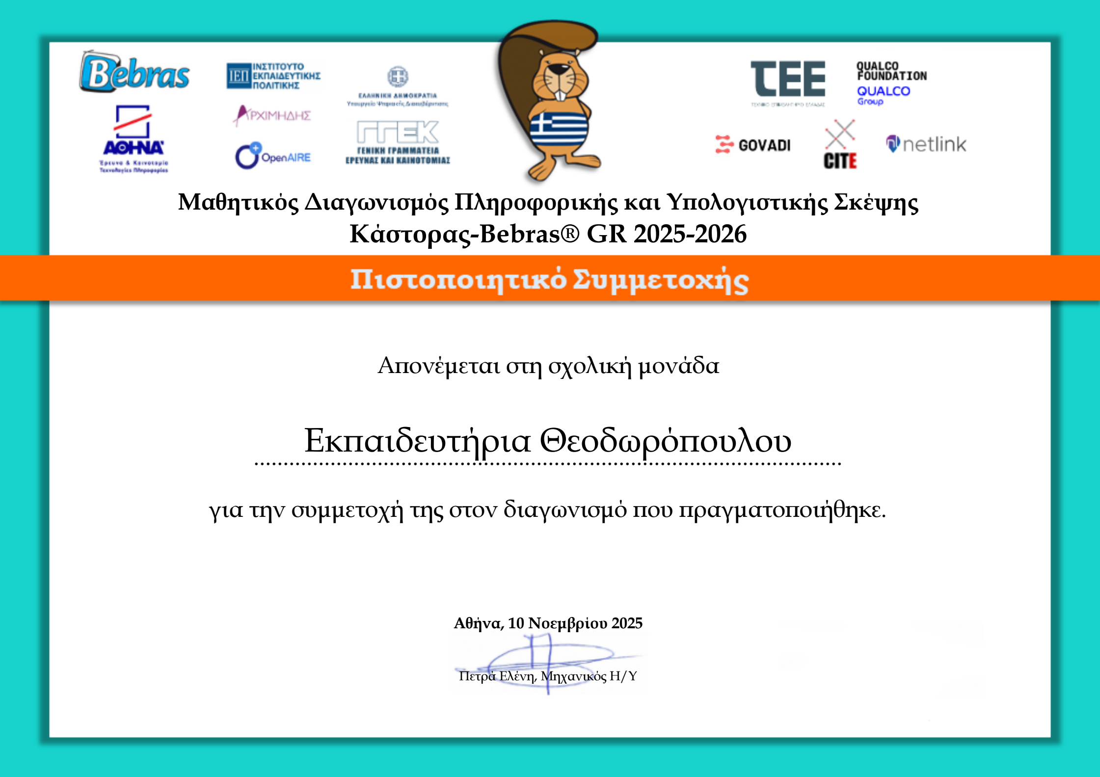 Ο Διεθνής Μαθητικός Διαγωνισμός Πληροφορικής και Υπολογιστικής Σκέψης Bebras είναι μια παγκόσμια πρωτοβουλία που στοχεύει να φέρει τους μαθητές και τις μαθήτριες σε επαφή με βασικές ιδέες της Πληροφορικής μέσα από σύντομα, ευρηματικά προβλήματα. Τα θέματα του Διαγωνισμού δεν απαιτούν γνώσεις προγραμματισμού ή εξειδικευμένη εξοικείωση με την τεχνολογία και βασίζονται κυρίως στη λογική σκέψη, στην ανάλυση, στην αναγνώριση προτύπων και στη συστηματική επίλυση προβλημάτων. Την χρονιά 2025-26, το σχολείο μας συμμετείχε με 35 μαθητές από την Δ Δημοτικού στα πλαίσια της ενότητας για την Εισαγωγή στον Προγραμματισμό.