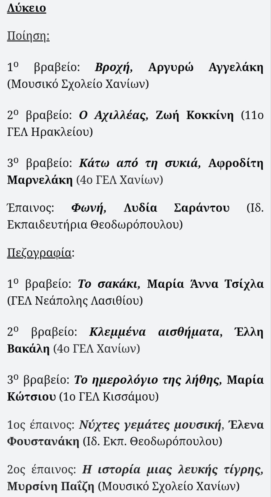 Το σχολείο μας καμαρώνει για τη συμμετοχή δύο ταλαντούχων μαθητριών μας, της Λυδίας Σαράντου (Α' Λυκείου) και της Έλενας Φουστανάκη (Α' Λυκείου) στον 42ο Παγκρήτιο Μαθητικό Λογοτεχνικό Διαγωνισμό του Συνδέσμου Φιλολόγων Χανίων. Και οι δύο κατάφεραν να ξεχωρίσουν ανάμεσα σε πολλές συμμετοχές και να κερδίσουν έπαινο στην ποίηση με το έργο "Φωνή" και στην πεζογραφία με το έργο "Νύχτες γεμάτες μουσική" αντίστοιχα. Η δημιουργικότητα, η ευαισθησία και το λογοτεχνικό τους ταλέντο αποδεικνύουν πόσο σημαντική είναι η λογοτεχνία για την έκφραση των νέων!